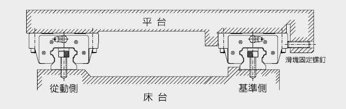在無固定螺絲的安裝中為確保從動側導軌與基準測導軌的平行度,HIWIN導軌可依下列所示安裝。