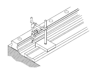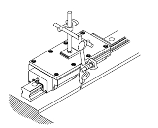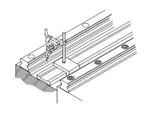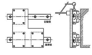 假基準面法 使用兩個滑塊緊密結合于測定用平板,依機臺滑軌裝配附近的基準面為準,使用千分表校準基準測導軌的側旁基準面,從上銀直線導軌的一端開始校準并依序以特定的扭力鎖緊裝配螺絲。 |
