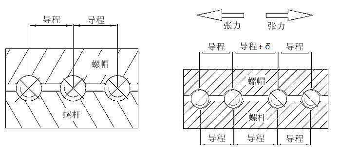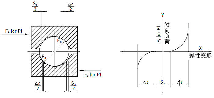 獨特的哥德式牙型珠槽能產生大約45°的鋼珠接觸角。由外部動力及內部預壓力產生軸向力Fa能產生兩種背隙。一種是鋼珠與珠槽之間制造所產生的正向背隙Sa。另一種是由垂直于接觸點的正向力Fn所產生的彈性變形△L。制造所產生的背隙能由內部預壓力P消除,此種預壓力可藉由雙螺帽、偏移節距的單螺帽或以鋼珠大小調整預壓的單螺帽產生。彈性變形是由內部預壓力和外部負荷產生進而造成失步效應。