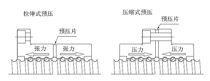 此種預壓藉由涼螺帽間的預壓片產生。“拉伸預壓”是由過大的預壓片有效的擠壓分開螺帽。“壓縮預壓”是由過小預壓片以螺栓將兩螺帽拉在一起。拉伸預壓是上銀精密級滾珠絲杠最常使用的方式。然而也能按照客戶的要求來制造壓縮預壓絲桿。滾珠絲杠的預壓必然會增加剛性,在選購的時候要說明預拉量為多少。