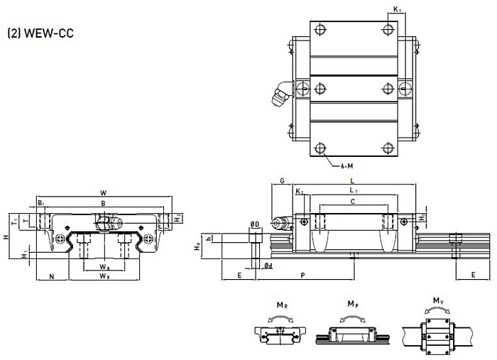WE系列采用四列鋼珠承受負荷的設計,藉由45度的接觸角度設計,具備四方向等負載特點以及自動調心的功能,可吸收安裝面的裝配誤差,得到高精度的訴求。同時增大線性滑軌寬度和降低組合高度,實現了超高扭轉阻抗,在環境有要求空間的限制時,或有大力矩作用的需求下,可采用單軸的方式使用。