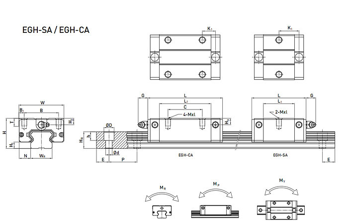 EGH系列屬于低組裝型滾珠滑動導軌,使用四列鋼珠承受負荷設計,使其具備高剛性、高負荷的特性,同時具備四方向等負載特色、及自動調心的功能,可吸收安裝面的裝配誤差,得到高精度的訴求。加上降低組合高度及縮短滑塊長度,非常適合高速自動化產業機械及空間要求的小型設備使用。滑塊上設有鋼珠保持器以防止鋼珠脫落,此設計不僅方便客戶安裝上銀直線導軌,當取下滑塊時也不會有鋼珠脫落的情形發生,且在精度允許下具備互換性。